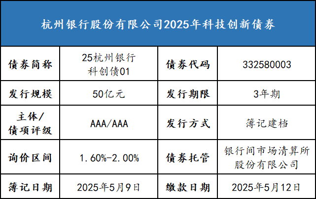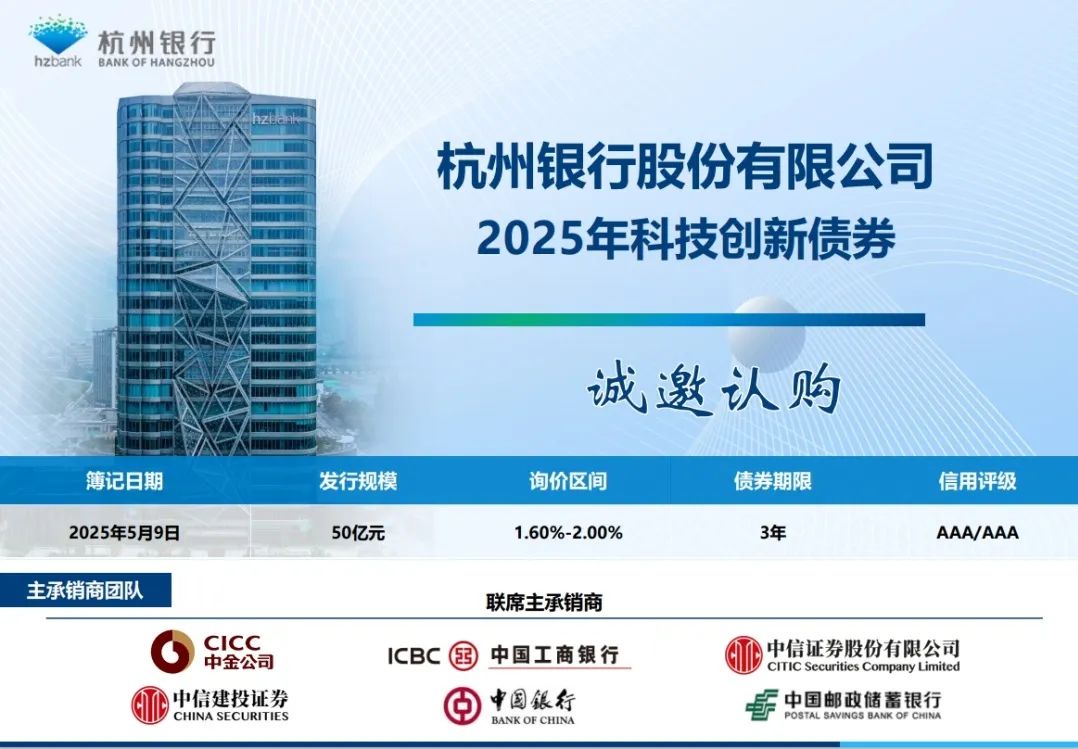2025年5月9日,杭州银行股份有限公司将在全国银行间债券市场发行2025年科技创新债券,发行规模50亿元,期限为3年期,主体和债项评级均为AAA。