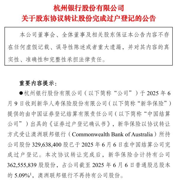 6月9日,杭州银行收到新华保险提供的、由中国证券登记结算有限责任公司出具的《证券过户登记确认书》,该笔交易已完成过户登记。转让完成后,新华保险合计持有杭州银行362,555,839股股份,占该行截至2025年6月6日普通股总股本的5.09%。本笔交易的股权,自完成过户登记之日起5年内不得转让。
