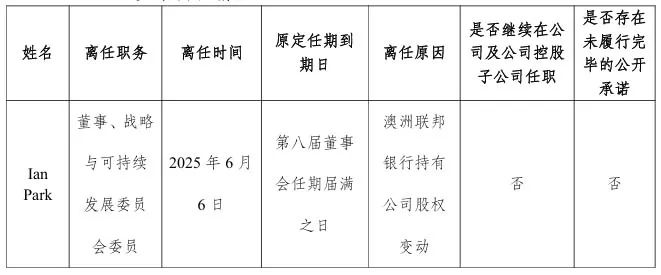 与此同时,该行董事IanPark先生“因澳洲联邦银行持有公司股权变动原因申请辞去公司董事会董事、董事会战略与可持续发展委员会委员职务”。