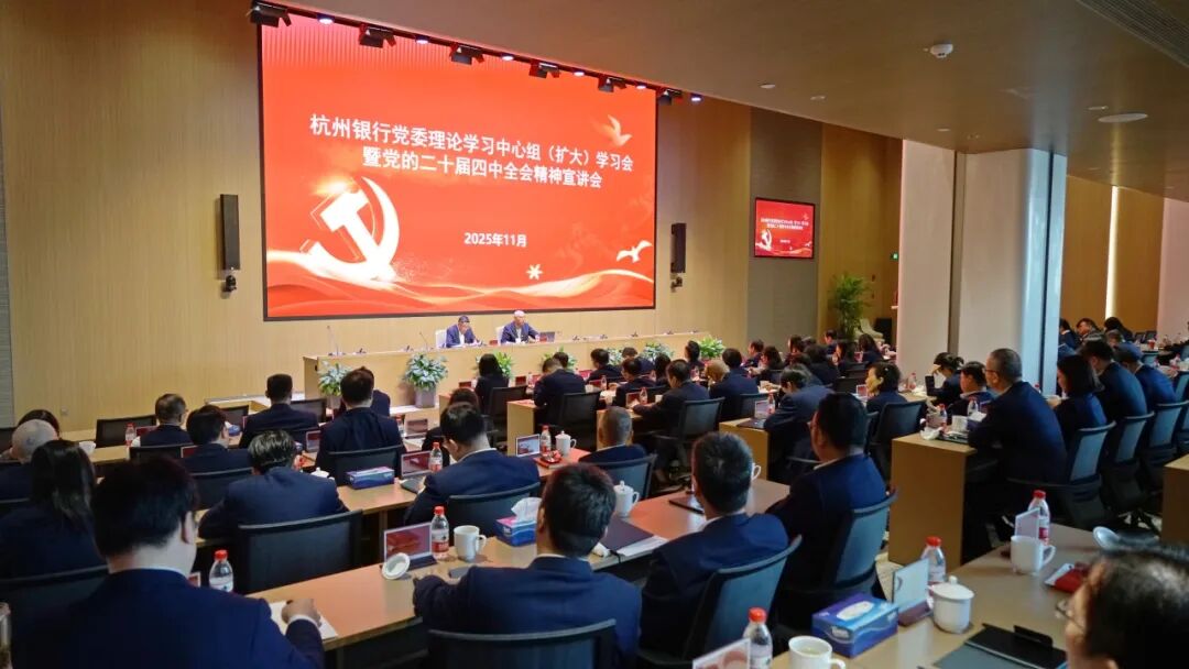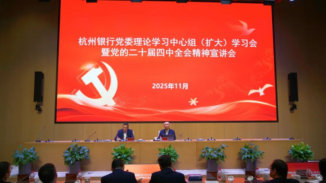 11月18日上午,杭州银行党委召开理论学习中心组(扩大)学习会暨党的二十届四中全会精神宣讲会,深入学习领会党的二十届四中全会精神,引导广大党员干部切实把思想和行动统一到党中央的决策部署上来,以更高站位、更大力度、更实举措谋划好、推进好“十五五”时期杭银高质量发展战略,全力打造中国价值领先的“优等生、好银行”。
