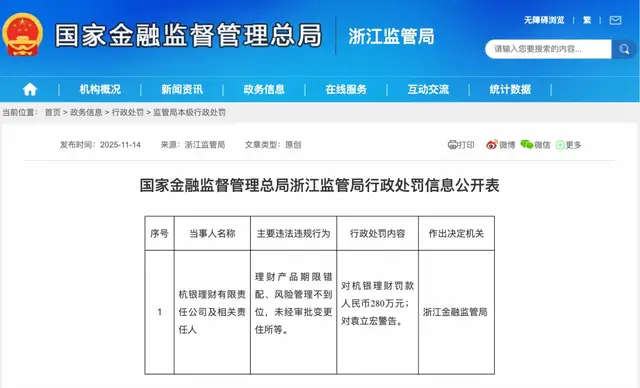 2025 年 11 月, 杭州银行 旗下 杭银理财 收到 280 万元罚单,涉及理财产品期限错配、投资决策风控不力、信息披露不充分等多项违规,这是其成立以来最大单笔罚款,3 年累计罚款已达 385 万元。