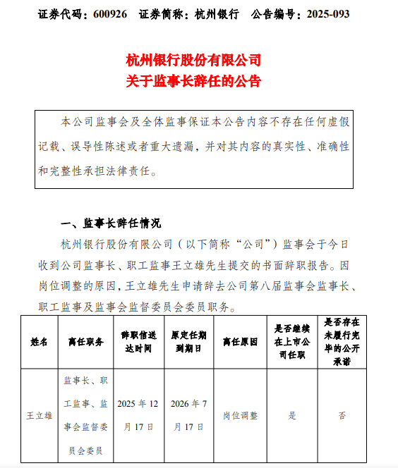 12月17日,杭州银行召开董事会及监事会会议,审议通过不再设立监事会的议案。同日公告显示,王立雄因岗位调整原因辞去监事长、职工监事职务,并继续担任党委委员;董事会同时聘任其为副行长,任职资格尚待国家金融监督管理总局浙江监管局核准。
