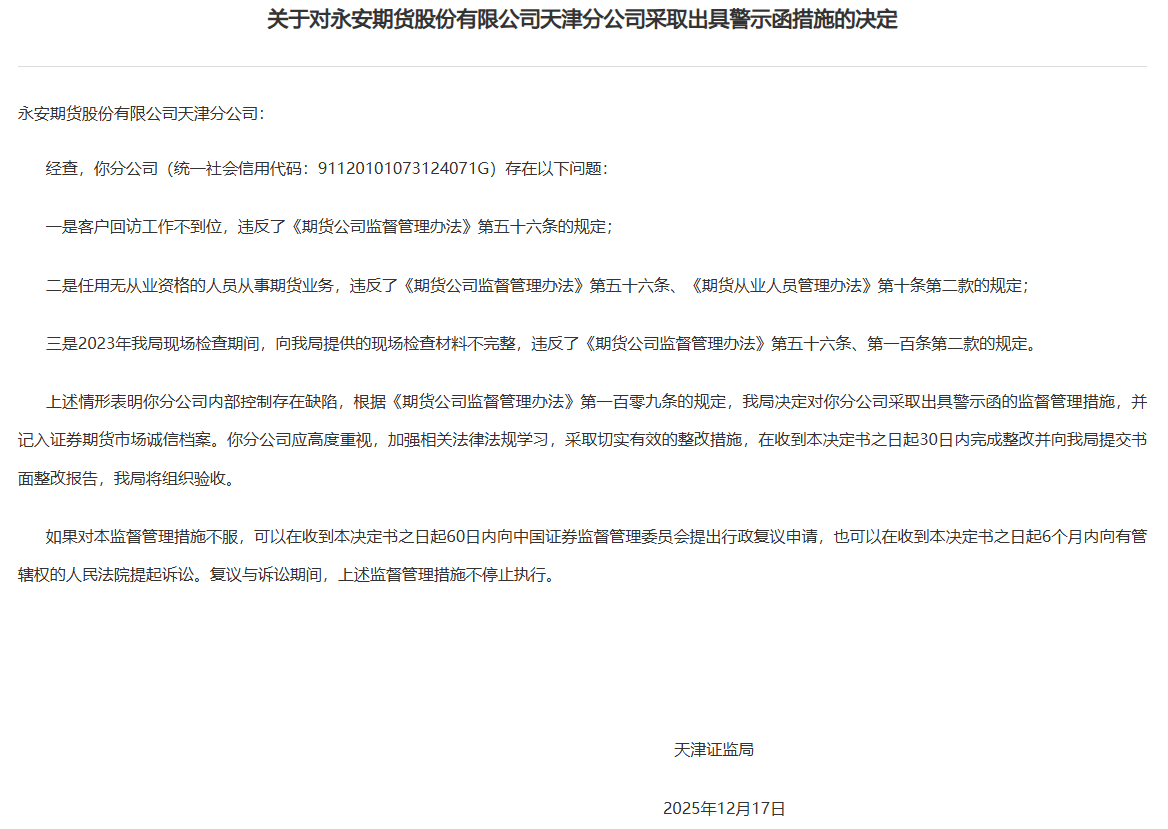 中国经济网北京12月24日讯中国证监会天津监管局网站近日公布关于对永安期货股份有限公司天津分公司采取出具警示函措施的决定。