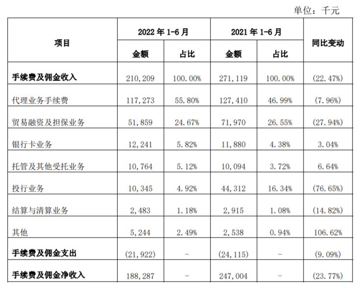 具体来看,手续费及佣金收入各项来源中,代理业务、贸易融资及担保业务、投行业务收入同比分别下降了7.96%、27.94%和76.65%,