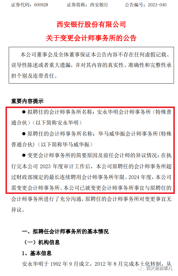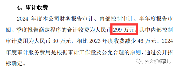 上交所主板上市公司西安银行(600928.SH)于2023年10月31日发布的《关于变更会计师事务所的公告》显示,在执行完本公司2023年度审计工作后,本公司原聘任的会计师事务所超过财政部规定的最长连续聘用会计师事务所年限,同意聘请安永华明担任本公司2024年度会计师事务所。2024年度本公司财务报告审计、内部控制审计、半年度报告审阅、季度报告商定程序的合计收费为人民币299万元(其中内部控制审计费用为人民币30万元),相比2023年度收费减少46万元。2024年度审计服务费用是根据审计工作量及公允合理的原则,通过公开招标确定。