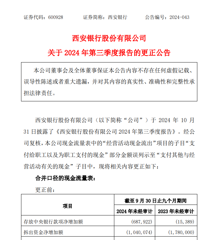 西安银行在更正公告中称,经公司复核,三季报中,公司现金流量表中的“经营活动现金流出”项目的子目“支付给职工以及为职工支付的现金”部分金额误列示至“支付其他与经营活动有关的现金”子目中。