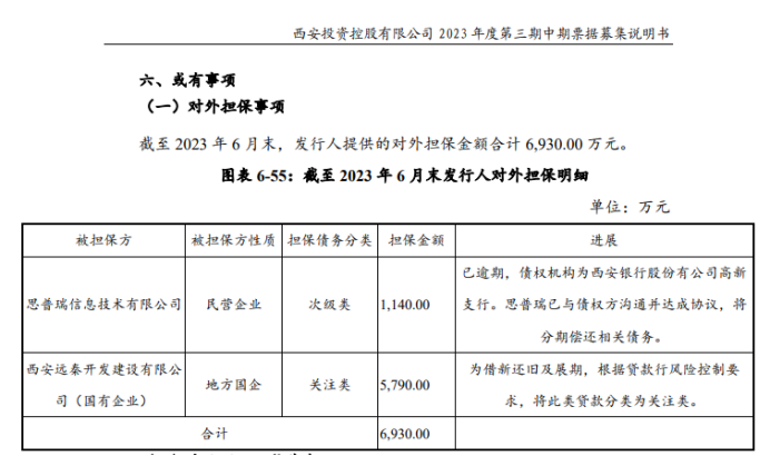 值得注意的是,截至去年6月底的披露节点,西安投资控股有限公司为一家叫思普瑞信息技术有限公司的,在西安银行担保借款的1140万元已出现了逾期。