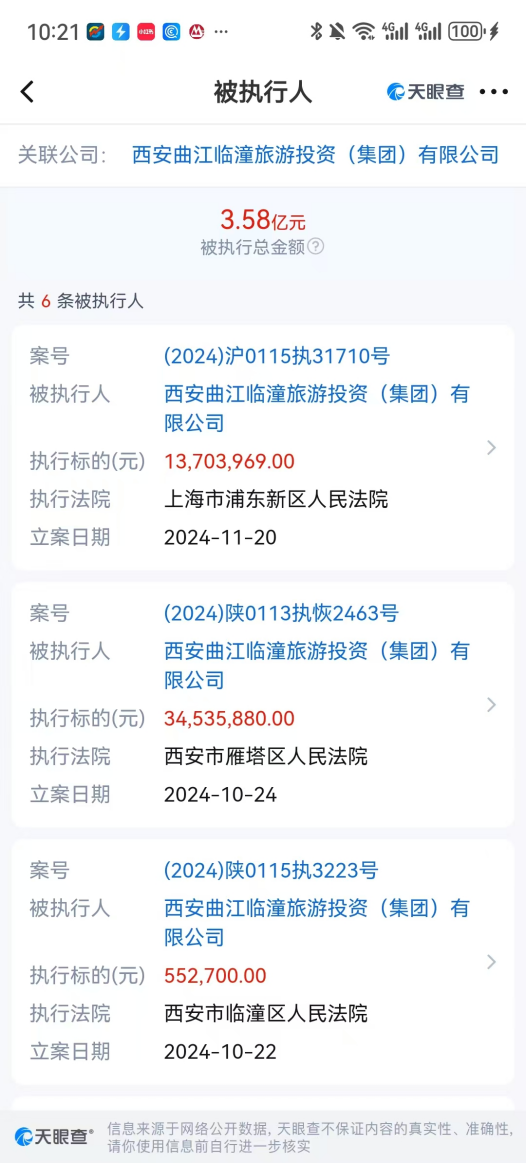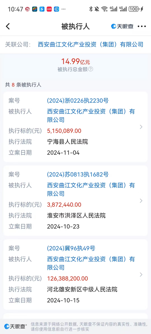 更何况,信息还显示,西安曲江文投集团有多条司法被执行信息,仅今年7月至11月被各地法院宣判执行的总金额高达近15亿元!给了这么多贷款,到时候会不会也出风险?