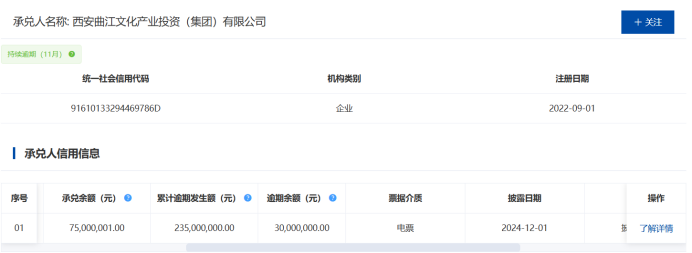 而且西安曲江文投集团的商票还出现了连续逾期。据上海票交所网站显示,截止到12月1日,西安曲江文投集团仍有3000万的商票逾期没有兑付,累计逾期发生额则是高达2.35亿元。从上述情况来看,西安曲江文投集团在公开市场已经是出现了很大风险。
