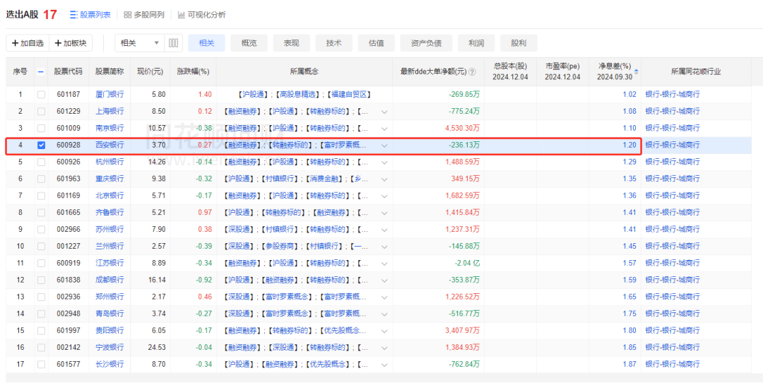 当然,这非一家之痛。近年在减费让利、反哺实体等背景下,银企净息差普遍持续收窄。考量在于,据同花顺数据,2024Q3 17家上市城商行中,净息差最高为长沙银行1.87%、最低为厦门银行1.02%,西安银行位列行业倒数第4。