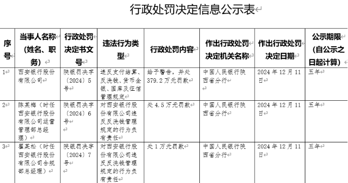 12月13日,中国人民银行陕西省分行发布的行政处罚信息公示表显示,西安银行被查获“违反支付结算、反洗钱、货币金银、国库及征信管理规定”的违法违规行为,被处以警告并罚款379.2万元处罚。中国人民银行陕西省分行对西安银行作出上述行政处罚决定日期为2024年12月11日。