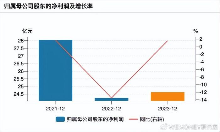 2021年—2023年,西安银行分别实现营业收入72.03亿元、65.68亿元、72.05亿元,同比增长0.91%、-8.82%、9.70%;实现归母净利润28.04亿元、24.24亿元、24.62亿元,同比增长1.74%、-13.55%、1.56%。