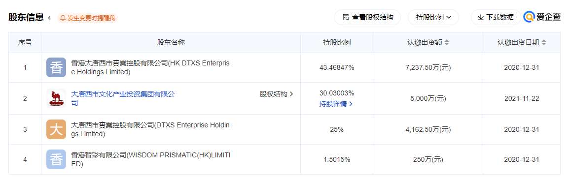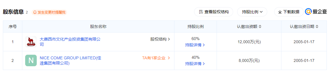 公开资料显示,西安大唐西市置业有限公司所属行业为房地产业,控股股东为大唐西市文化产业投资集团有限公司(简称“大唐西市文化产业投资集团”),持股比例为60%。西安大唐西市实业有限公司所属行业为通用设备制造业,主要股东为香港大唐西市实业控股有限公司、大唐西市文化产业投资集团、大唐西市实业控股有限公司,持股比例分别为43.4685%、30.03%、25%。