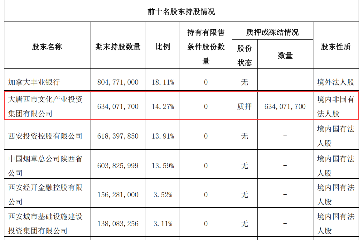 截至本报告披露日,大唐西市文化产业投资集团共持有西安银行6.30亿股股份,占该行总股本的比例为14.17%;累计质押股份总数6.30亿股,占其持股数量的比例为100%。