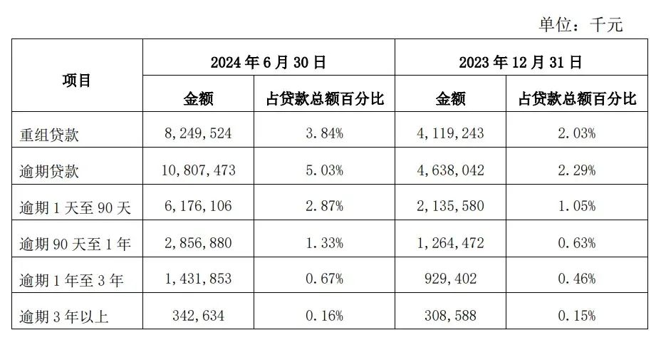 与此同时,西安银行的资产质量承压明显。截至2024年6月末,该行逾期贷款余额108.07亿元,较上年末增加61.69亿元,增幅高达133%;重组贷款82.5亿元,较上年末增加41.31亿元,增幅超过100%;逾期贷款和重组贷款占总贷款的比例分别达到5.03%和3.84%。