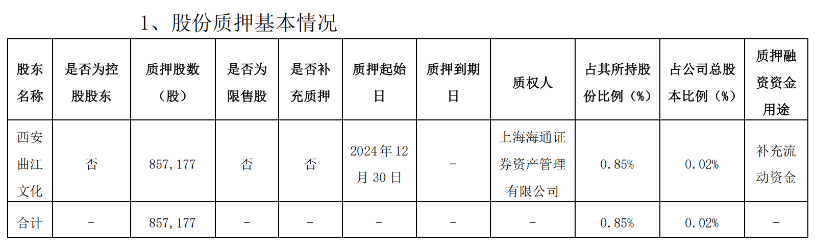 1月2日,西安银行发布公告称,该行股东西安曲江文化产业风险投资有限公司(简称“西安曲江文化”)2024年12月30日将其持有的该行857,177股股份质押给上海海通证券资产管理有限公司,质押融资资金用途为“补充流动资金”。上述股份2024年12月27日刚刚解质。