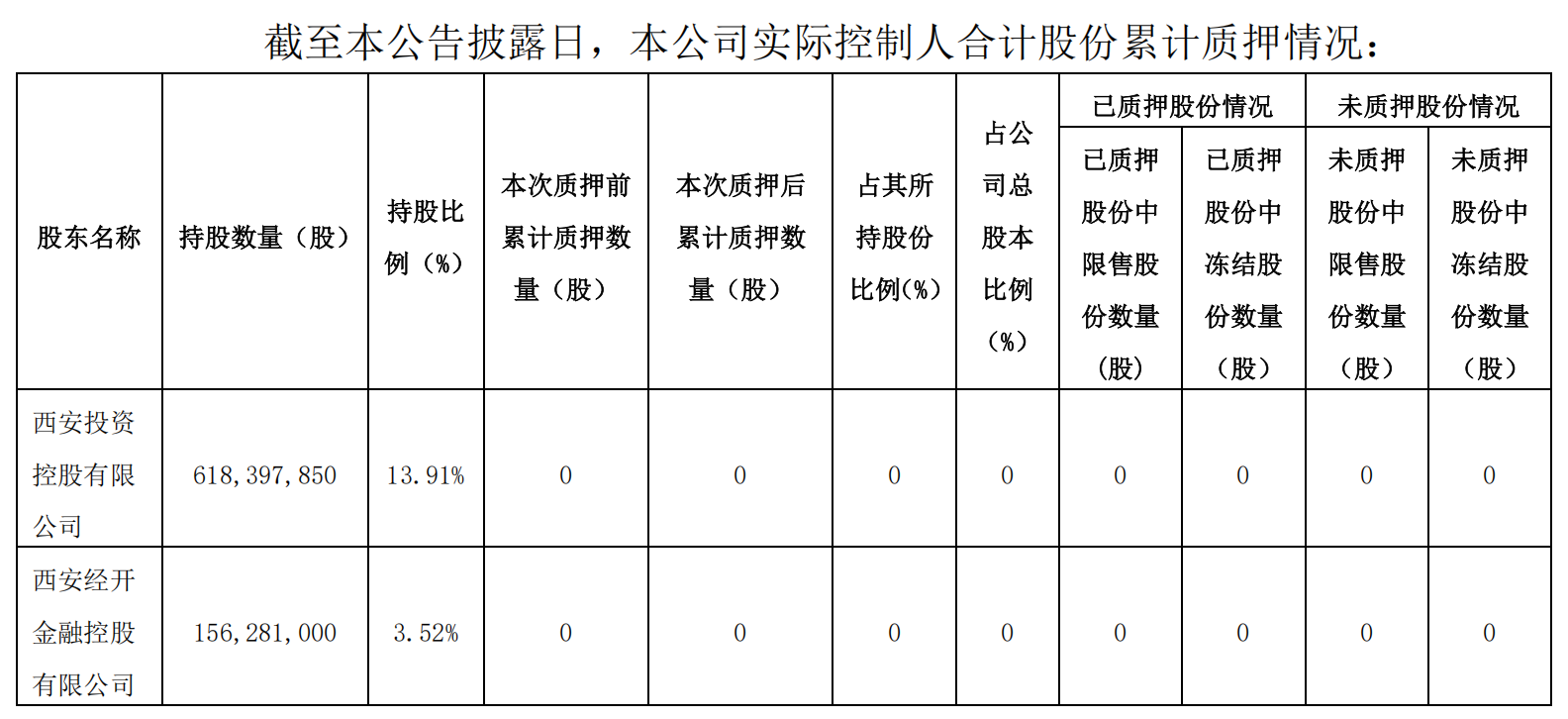 据半年报披露,西安银行的实际控制人为西安市人民政府。西安市人民政府通过西安曲江文化、西投控股、西安城投(集团)等7家企业合计持有西安银行股份数量为12.18亿股,持股比例为27.42%。截至本公告披露日,该行实际控制人合计股份累计质押数量为1亿股,质押股份占其所持股份比例为8.21%,占西安银行总股本比例为2.25%。