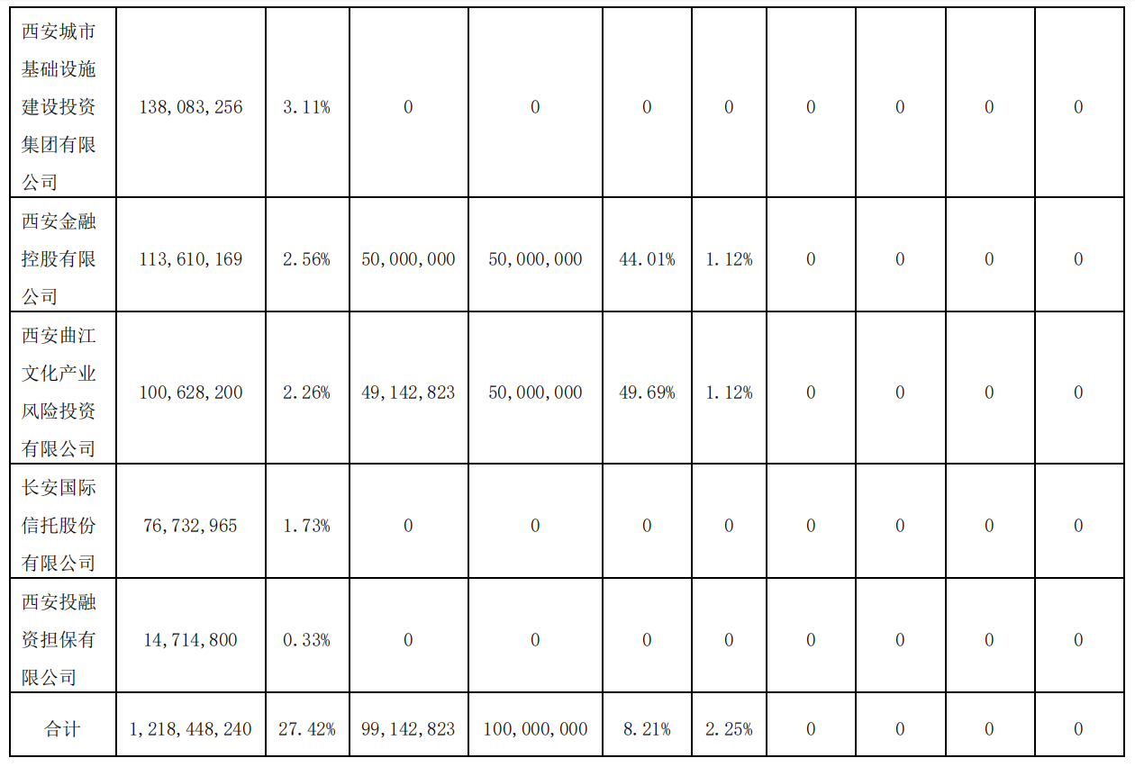 截至本公告披露日,西安曲江文化持有西安银行股份数量为1.01亿股,本次质押后累计质押股份数量为5000万股,质押股份占其所持股份比例为49.69%,占西安银行总股本比例为1.12%。