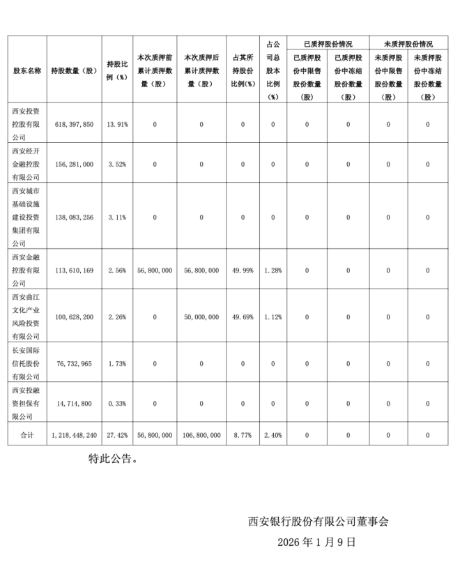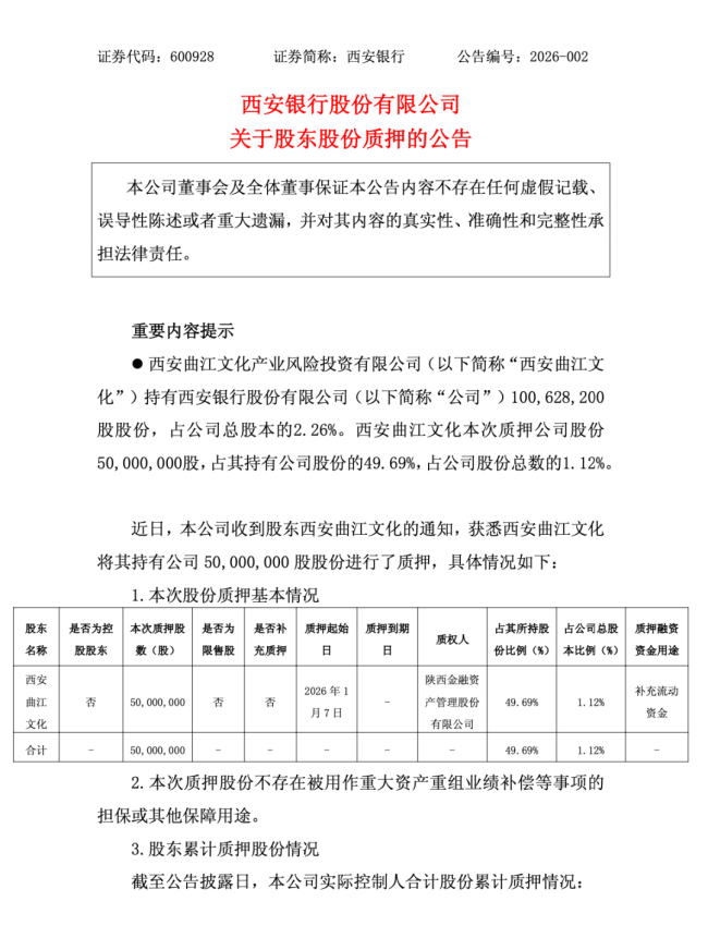 西安银行1月10日公告显示,股东西安曲江文化产业风险投资有限公司将所持西安银行5000万股股份进行质押,占其持股近五成,质权人为陕西金融资产管理公司,融资用途明确为“补充流动资金”。