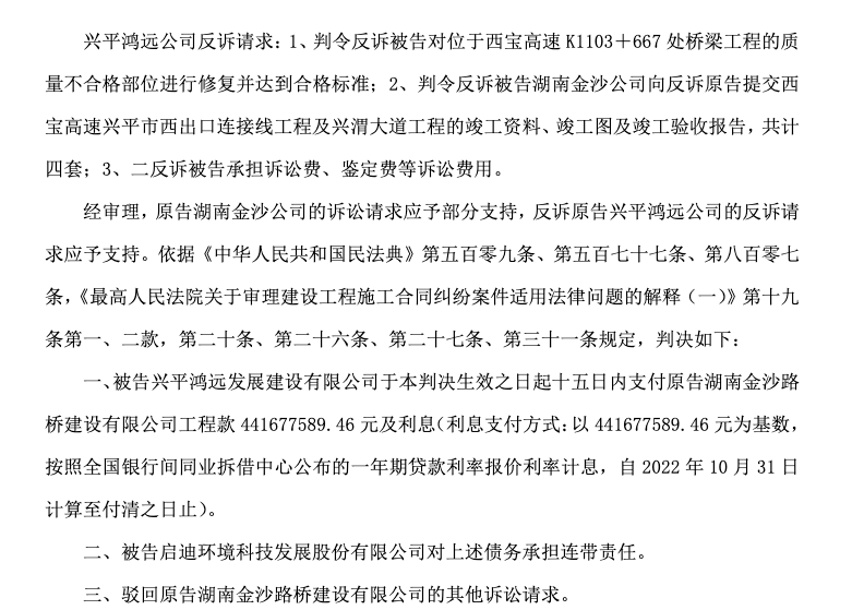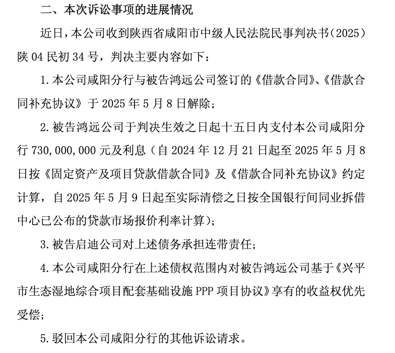 2026年1月,该案迎来一审判决,法院依法支持西安银行核心诉求,判决解除双方借款合同,鸿远公司需在判决生效15日内偿还7.3亿元本金及对应利息,启迪环境承担连带清偿责任,同时确认西安银行对案涉项目收益权享有优先受偿权,案件受理费绝大部分由被告方承担。