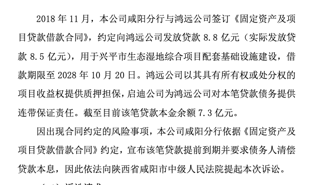 同年11月,双方正式签订项目贷款合同,西安银行咸阳分行实际发放贷款8.5亿元,资金实行专户管理、专款专用,仅限项目建设使用,同时由启迪环境提供连带责任保证,鸿远公司以项目收益权质押,搭建起完善的风险防控体系。