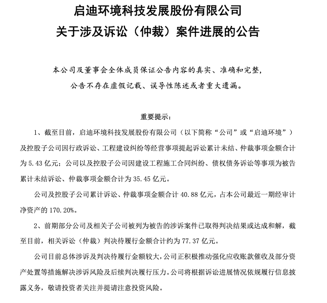 更关键的是,启迪环境已于2025年9月下旬被宜昌中院裁定进入预重整程序,自身深陷多起大额诉讼与债务违约泥潭。截至2026年1月,公司前期已判决待履行金额合计超70亿元,整体偿付能力已实质性枯竭。