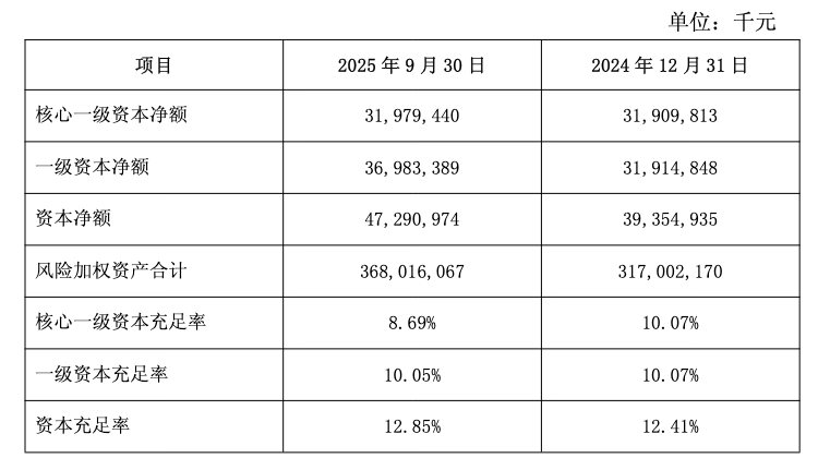 资本层面,2025年三季度末核心一级资本充足率降至8.69%,较年初大幅下滑1.38个百分点,已逼近7.5%的监管底线。