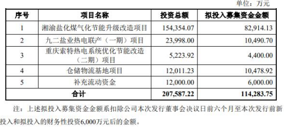 本次非公开发行股票数量不超过1.80亿股(含本数),未超过本次发行前公司总股本的30%,并以中国证监会的核准文件为准。本次非公开发行股票募集资金总额不超过11.43亿元(含本数),扣除发行费用后,募集资金净额拟分别用于湘渝盐化煤气化节能升级改造项目、九二盐业热电联产(一期)项目、重庆索特热电系统优化节能改造(二期)项目、仓储物流基地项目、补充流动资金。