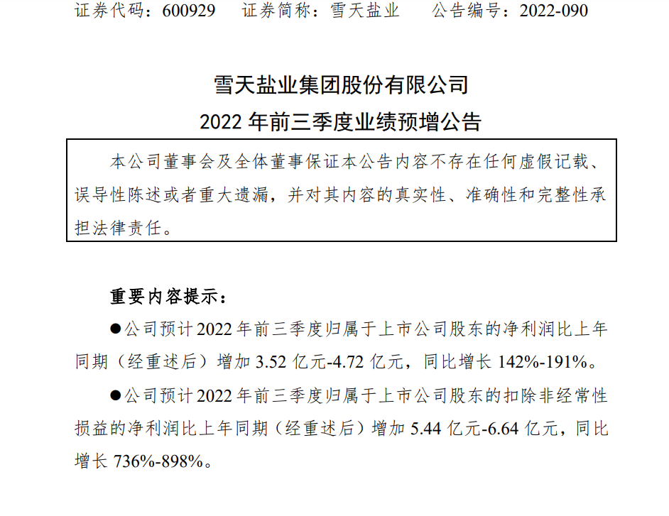 10月16日晚间雪天盐业发布前三季度业绩预增公告,预计2022年前三季度实现归属于上市公司股东的净利润6.00亿元-7.20亿元,同比增长142%-191%。