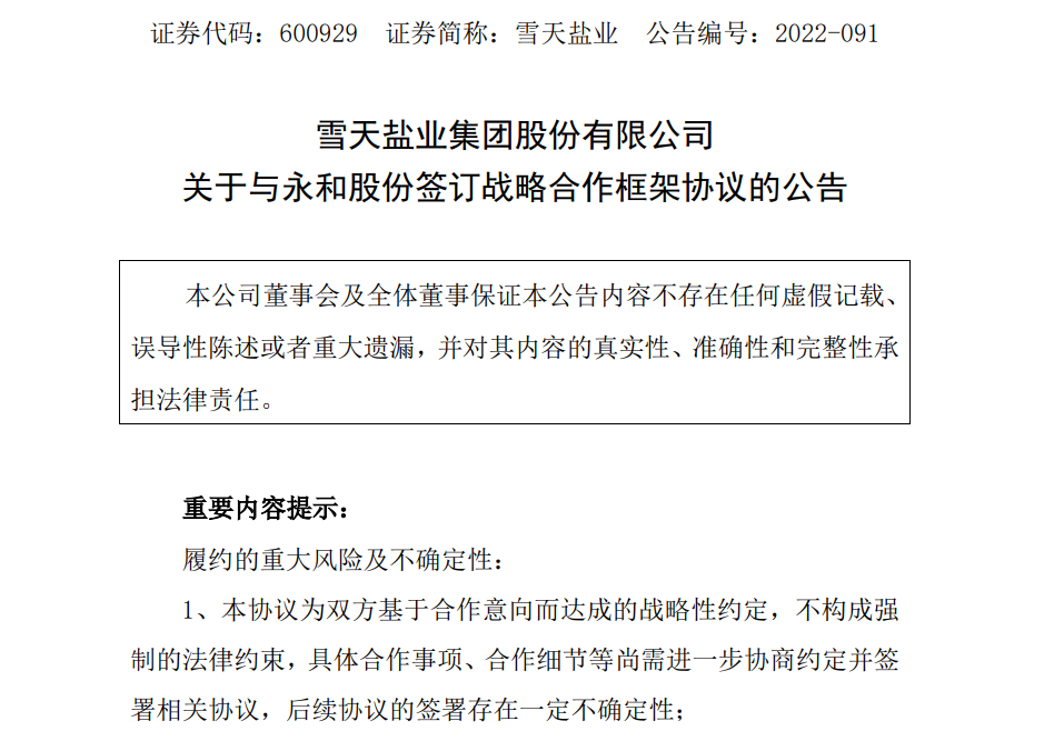 就在今日,雪天盐业发布了“关于与永和股份签订战略合作框架协议的公告”。
