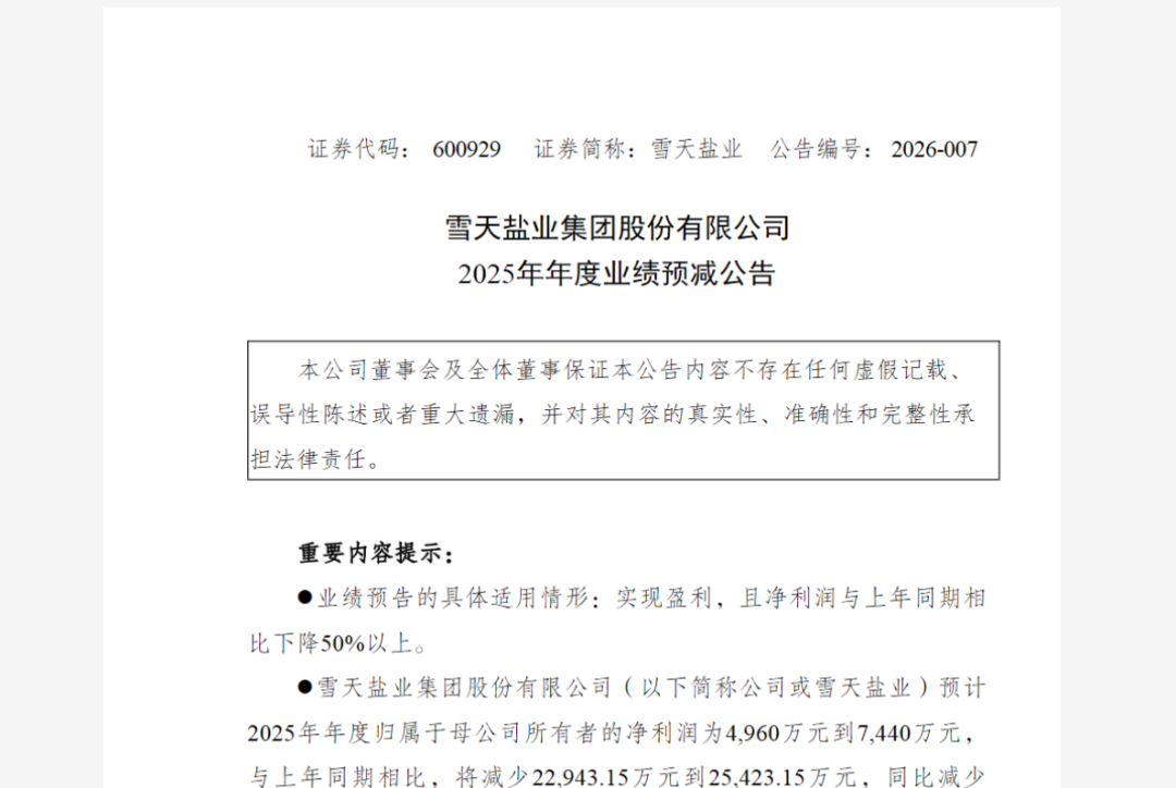 在这场行业变局中,昔日的区域龙头雪天盐业也未能独善其身,正面临着净利润连续下滑的严峻挑战。最新数据显示,该公司预计实现归母净利润4,960万元至7,440万元,同比降幅达75.51%至83.68%;扣除非经常性损益后,净利润仅剩130万元至195万元,同比下降幅度超过99%。而且,这已是其业绩连续第三年出现下降。