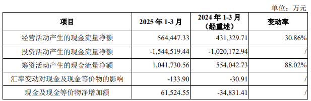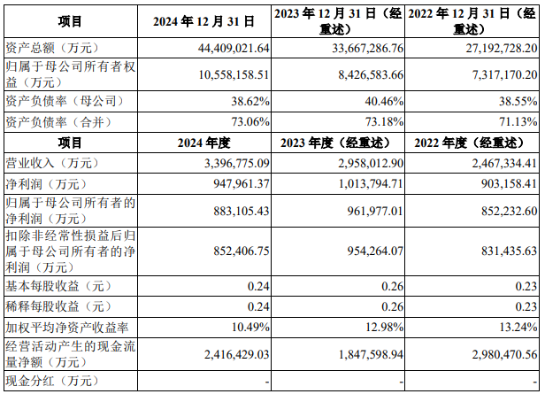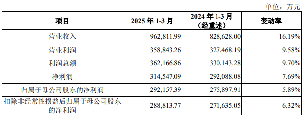 2025年1-3月,公司实现营业收入962,811.99万元,同比增长16.19%;净利润314,547.09万元,同比增长7.69%;归属于母公司股东的净利润292,157.39万元,同比增长5.89%;扣除非经常性损益后归属于母公司股东的净利润288,813.77万元,同比增长6.32%;经营活动产生的现金流量净额564,447.33万元,同比增长30.86%。