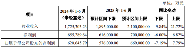 公司预计2025年1至6月营业收入为1,895,000.00万元至2,100,000.00万元,同比变动9.84%至21.72%;净利润616,000.00万元至700,000.00万元,同比变动-6.00%至6.82%;归属于母公司股东的净利润576,000.00万元至669,000.00万元,同比变动-7.19%至7.79%;扣除非经常性损益后归属于母公司股东的净利润570,000.00万元至664,000.00万元,同比变动-7.18%至8.13%。