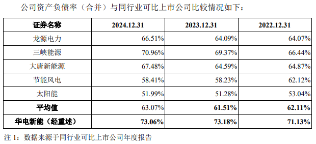 2022年末至2024年末,华电新能合并资产负债率(合并)分别为71.13%、73.18%和73.06%,同行业可比上市公司资产负债率平均值分别为62.11%、61.51%、63.07%。