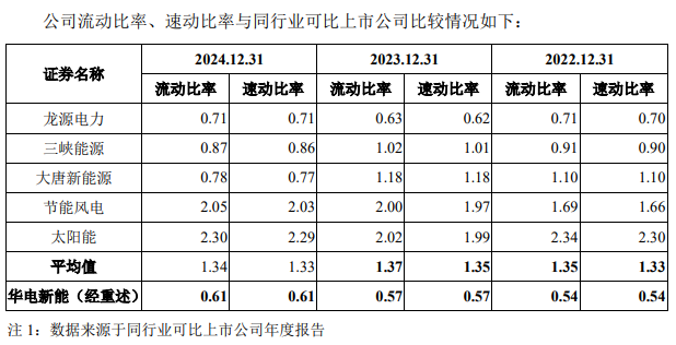 2022年末至2024年末,华电新能流动比率分别为0.54、0.57、0.61,同行业可比上市公司平均值分别为1.35、1.37、1.34;速动比率分别为0.54、0.57、0.61,同行业可比上市公司平均值分别为1.33、1.35、1.33。