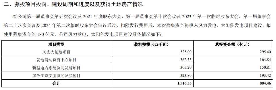 华电新能2025年7月11日披露的首次公开发行股票并在主板上市招股说明书显示,扣除发行费用后,本次募集资金将投入风力发电、太阳能发电项目建设,拟使用募集资金约180亿元。