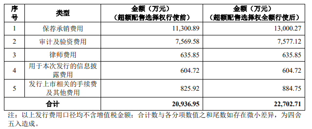 华电新能本次发行费用总额为20,936.95万元(超额配售选择权行使前),22,702.71万元(超额配售选择权全额行使后),其中保荐承销费用11,300.89万元(超额配售选择权行使前),13,000.27万元(超额配售选择权全额行使后)。