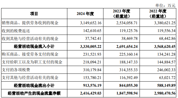 2024年,华电新能净利同比下降。2022年至2024年,华电新能净利润分别为903,158.41万元、1,013,794.71万元、947,961.37万元,归属于母公司所有者的净利润分别为852,232.60万元、961,977.01万元、883,105.43万元,扣除非经常性损益后归属于母公司所有者的净利润分别为831,435.63万元、954,264.07万元、852,406.75万元,经营活动产生的现金流量净额分别为2,980,470.56万元、1,847,598.94万元、2,416,429.03万元。