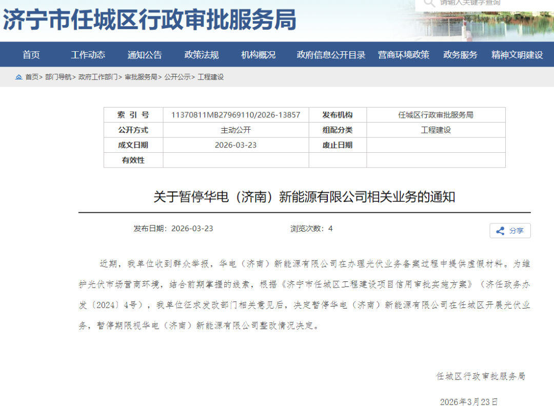 泰山财经记者获悉,3月23日,济宁市任城区行政审批服务局发布《关于暂停华电(济南)新能源有限公司相关业务的通知》,决定暂停华电(济南)新能源有限公司(简称“华电济南新能源”)在任城区开展光伏业务,暂停期限视其整改情况而定。