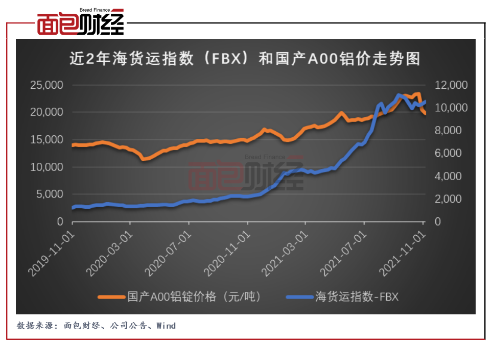 图2:近2年海货运指数(FBX)和国产铝价走势图