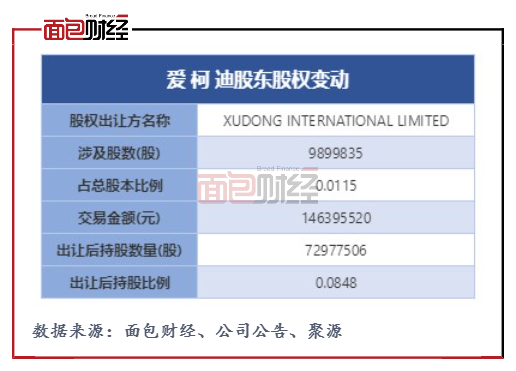 11月8日,爱柯迪发布公告称,大股东XUDONG INTERNATIONAL LIMITED通过集中竞价方式累计减持公司股份约989.98万股,变现金额约达1.46亿元,提前完成股份减持计划。