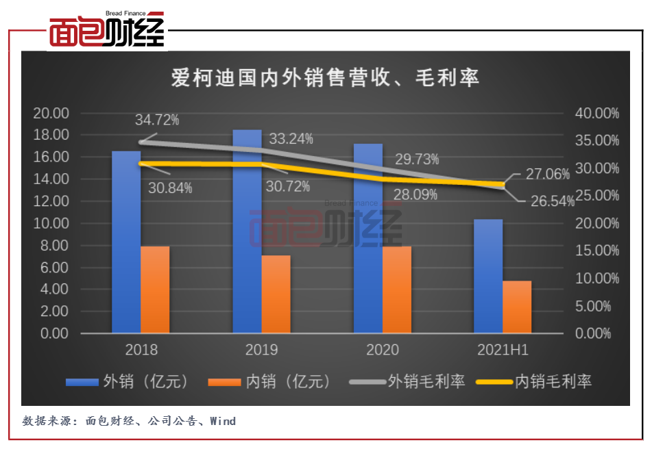 图3:2018年至2021年上半年爱柯迪国内外销售营收、毛利率