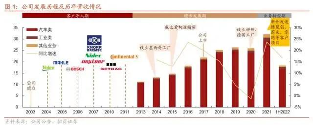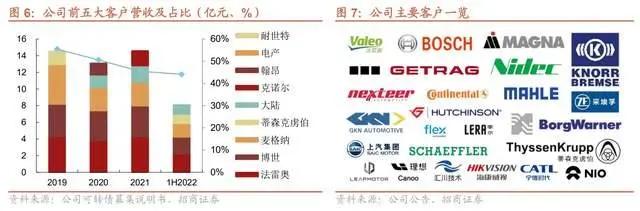 公司的业务均衡覆盖美洲、欧洲以及亚洲的汽车工业发达地区,主要客户为全球知名的大型跨国汽车零部件供应商,包括法雷奥、博世、麦格纳、格特拉克、电产、耐世特、大陆、克诺尔、马勒等,2019~1H22 公司前五大客户占比分别为 55.5%、50.6%、45.5%和44.1%,随着公司业务结构的转型升级,前五大客户占比不断下降。