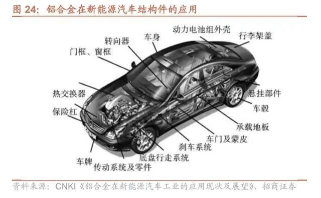 铸造铝合金主要用于制造新能源汽车发动机零部件、壳体类零件和底盘上的其他零件,如轿车发动机缸体、缸盖、离合器壳、保险杠、车轮、发动机托架等几十种零件,轧制材、锻造材、挤压材等变形铝合金主要用于汽车车身,如发动机罩、车顶棚、车门、翼子板、行李箱盖、地板、车身骨架及覆盖件。