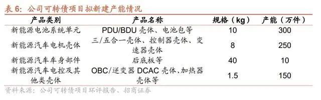 2022 年 10 月,公司可转债项目成功上市,该项目专注于新能源汽车三电系统核心零部件及大型结构件,产品范围涵盖新能源汽车电池系统单元、新能源汽车电机壳体、新能源汽车车身部件和新能源汽车电控及其他类壳体等产品,共计产能 710 万件,项目满产后对应年产值 23.28 亿元。
