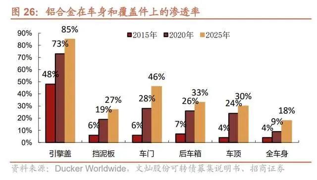 根据 Ducker Worldwide 的预测,铝制引擎盖的渗透率会从2015年的48%提升到2025年的85%,铝制车门渗透率会从2015年的6%提升到2025年的46%。