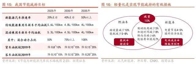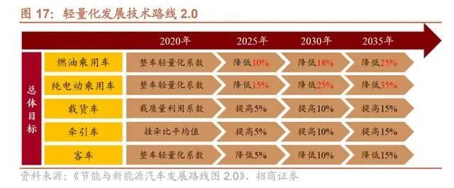根据 2020 年 10 月发布的《节能与新能源汽车技术路线图 2.0》,摈弃了以往以整车整备质量和轻质材料用量为衡量标准的传统做法,引入了“整车轻量化系数”、“载质量利用系数”、“牵挂比”等作为整车轻量化水平的依据;到 2035 年,燃油车整体轻量化系数比 2020 年降低 25%,而纯电动车整车轻量化系数需降低 35%。