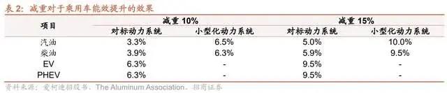 汽油乘用车减重 10%可以减少 3.3%的油耗,减重 15%可以减少 5%的油耗;对于柴油乘用车,则可以分别相应减少 3.9%和 5.9%的油耗。