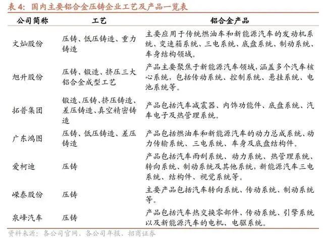 目前掌握铝合金成型工艺的国内厂商主要有文灿股份、旭升股份、拓普集团、广东鸿图、爱柯迪、嵘泰股份、派生科技和泉峰汽车等,市场集中度较低。