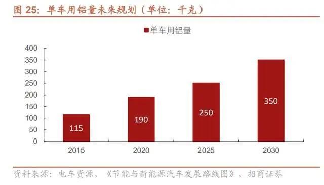 根据《节能与新能源汽车发展路线图》,我国未来单车用铝量将不断提高,预计 2025 年单车用铝量达 250kg,2030 年单车用铝量达 350kg。